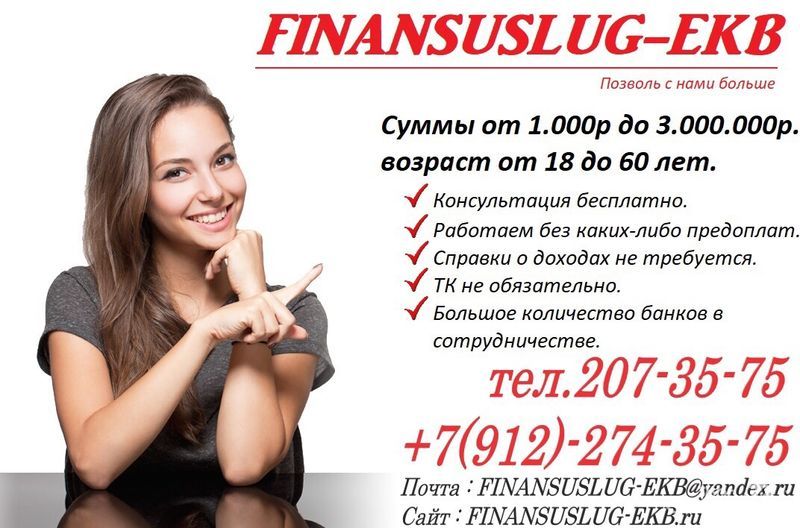 Компания «FINANSUSLUG-EKB» приглашает всех желающихНа бесплатную консультацию населения по финансовым вопросам.Перечень услуг нашей компании:1.Оформление потребительских кредитов, кредит под залог, оформление ипотеки2.Проверка БКИ НБКИ ОКБ3.Проверка задолженностей Приставов (ФССП)4.Проверки Судимостей5.Рефинансирование6.БанкротствоРаботаем с клиентами у которых прописка в Паспорте : на УРАЛЕНаши квалифицированные специалисты проведут комплексный анализ Вашей финансовойситуации, правильность заполнениедокументов для банка, штрафы, приставы и т.д. По статистике с нашей помощью 85-90%одобрение т.к. наши клиенты являются лояльными для банков партнеров и заявкирассматриваются на индивидуальных условиях!Не берем предоплату! Вы оплачиваете вознаграждение за нашу работу, только послеполучения денег в банке! (Остерегайтесь мошенников)
