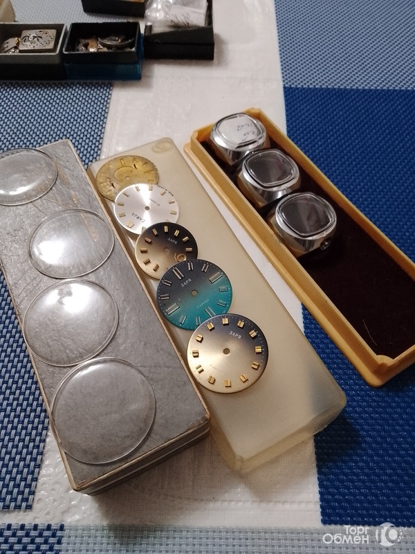 Циферблаты, корпуса, стекла для циферблатов, винтики, мосты для ручных механических часов времён СССР. Прессы для ремонта и сборки часов.